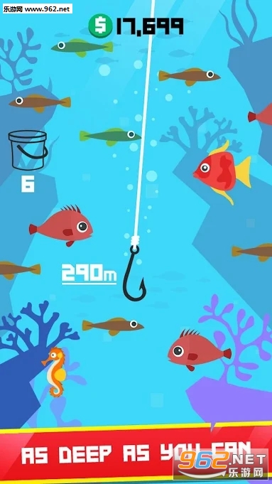 小心控制鱼钩移动,更好的钩取大鱼。贩卖鱼获得金币升级渔具,钓得更深,钓到更多的鱼!