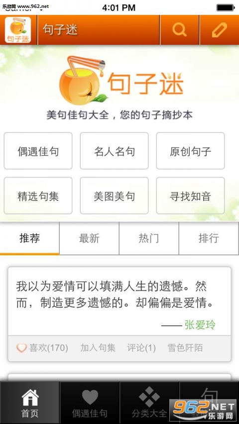 句子迷APP客户端是一个随身摘抄本,在这里您可以随时发布、收藏和查阅您喜欢的句子,句子迷客户端汇集众多名人名言、经典语录,是一部美句佳句大全,是一个高品质句子分享应用。