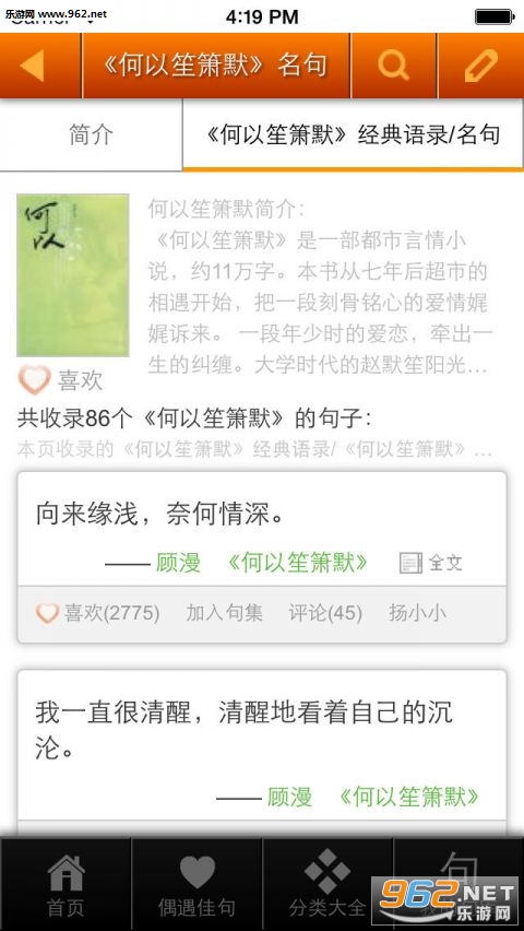 非常不错的佳句欣赏软件,朋友们可以在软件中找到众多优美的句子,可以将这些句子返送到、朋友圈等地方,也可以借鉴在写作等丰富,还可以用来泡妹子等,喜欢的朋友可以下载试试。