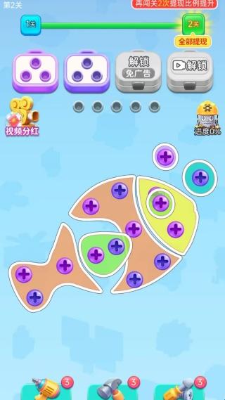 4、精美的画面与音效:拥有精致的3D卡通风格画面,色彩鲜艳,细节丰富,给玩家带来愉悦的视觉享受。同时,配合轻松欢快的背景音乐和逼真的螺丝拧动音效,进一步增强了游戏的沉浸感。