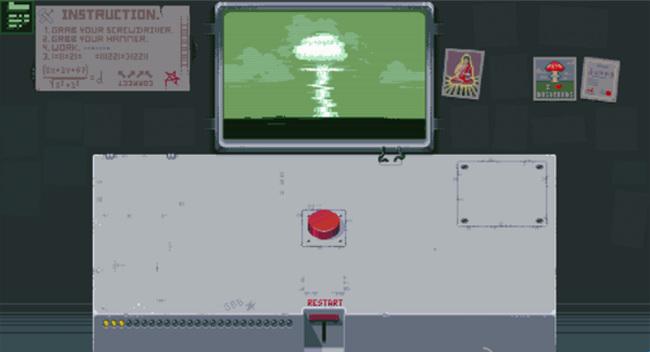 3、第三盏灯:先点击RESTART回到初始状态,在初始状态下点击一次红色按钮。然后会出现开关,这个时候点击一下开关,红灯亮起。再点击红色按钮,控制台的左侧会开始进入倒计时。最后屏幕出现原子弹爆炸的画面,然后就可以点亮第三盏灯了。