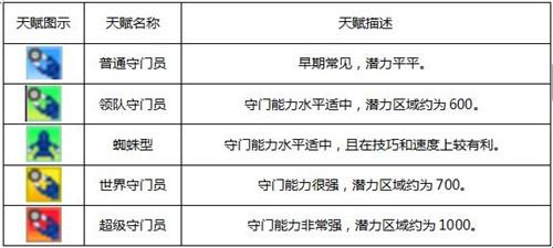 3、还有一种单独列出天赋属性的,那便是球队里关键的守门员了,其天赋描述与前两组略有区别。而且这里强调一个识别技巧,可以根据颜色判断球员是不是足够强大:即,能力测评从弱至强颜色表示依次为蓝、绿、黄、红