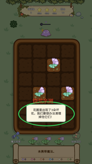 3、花圃里出现了3朵坏花,我们要想办法清理掉他们