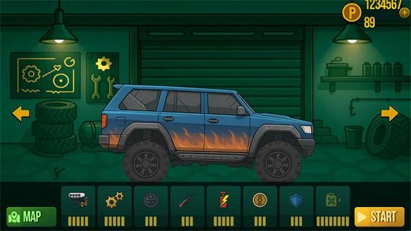3、在正式开始前玩家可以对自己的车辆进行升级,你可以选择不同的设施来提升等级,升级完毕后点击start就可以开始。