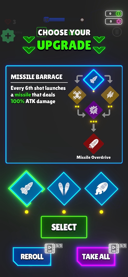 升级后会有着技能可以学习,点击【TAKE ALL】免广告获得全部技能