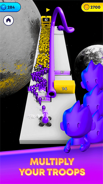 2.按住大炮不松手就可以源源不断地发射出炮弹人,炮弹人经过倍数门会获得数量上的增长,建议朝着倍数较高的门发射。