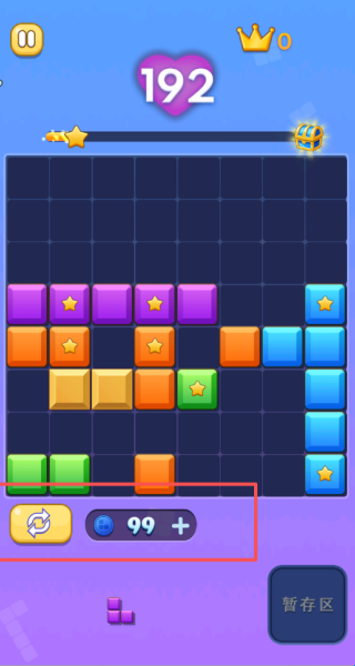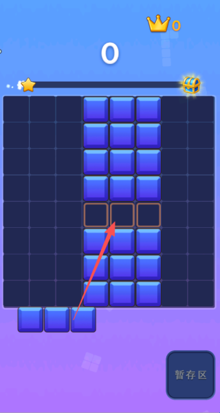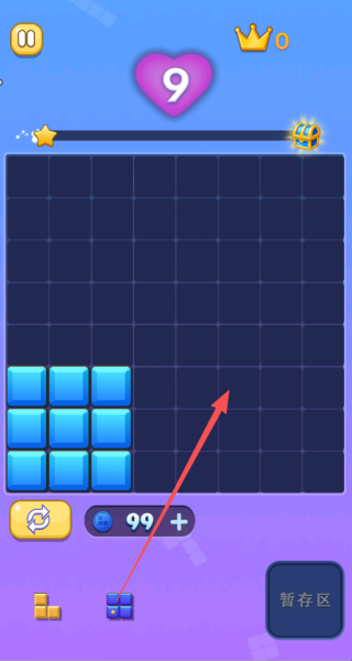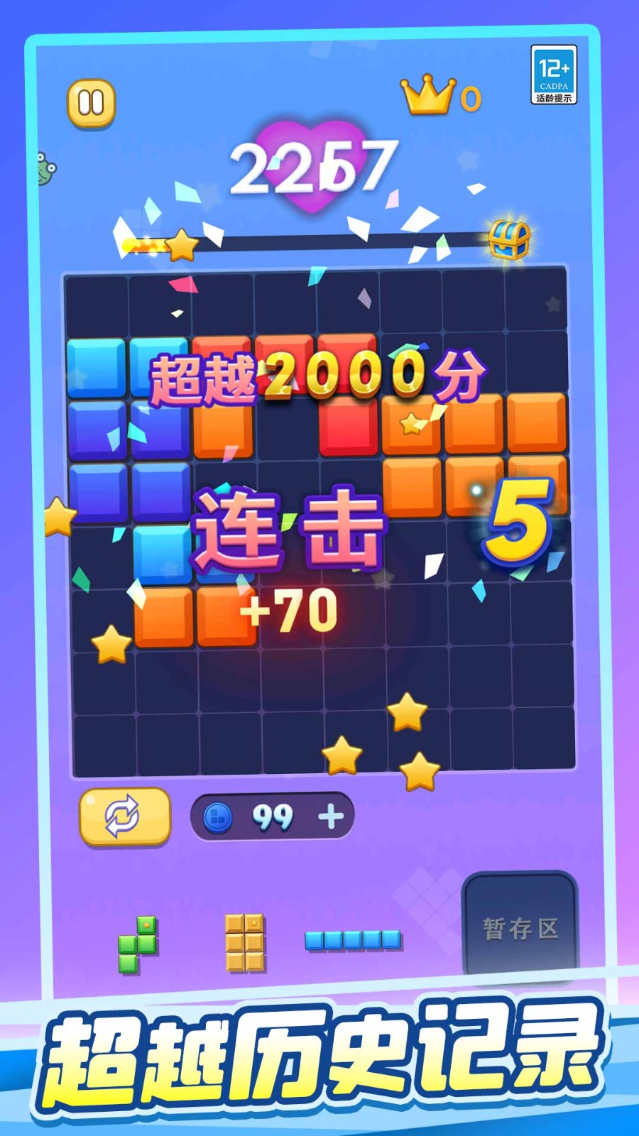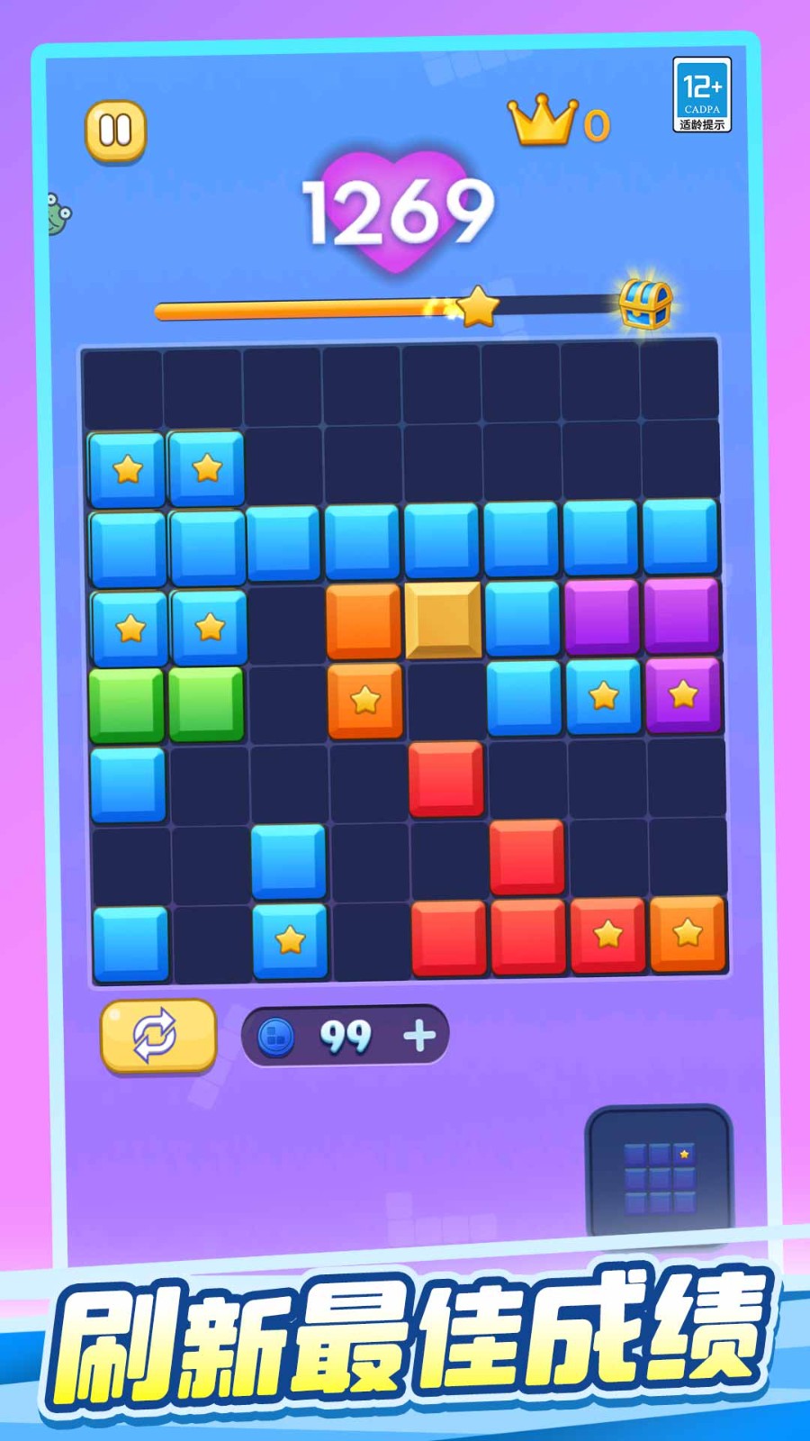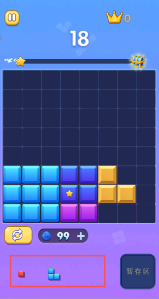 3、拖动模式:将屏幕下方的三个备选方块拖入宫格中,一行或一列铺满即可消除,直至备选方块无法放置,消除游戏结束