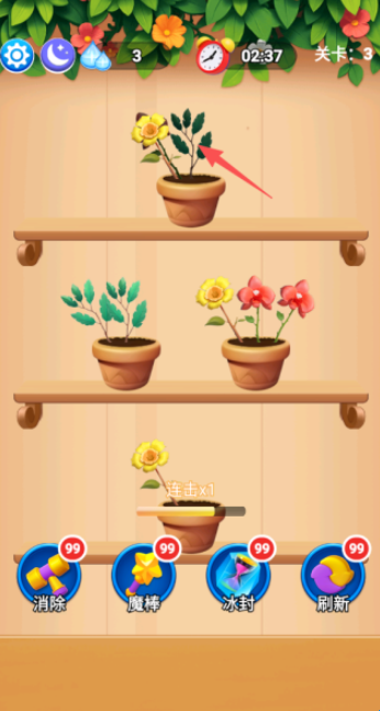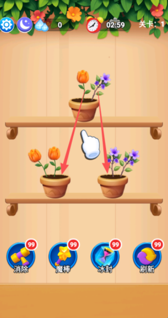 1、通过拖拽合并相同品种的植物,当三朵相同花朵相邻时会自动合成高级品种并消除。