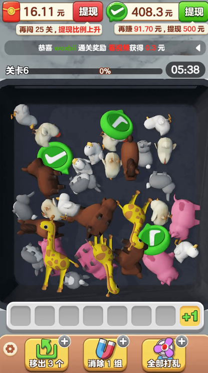 抓了个鹅,一款只要过关即可提现红包的赚钱游戏·。游戏的核心玩法还是消除,通过收集三个一样的物品完成消除,只要全部消除了全部物品,那么就能抓到一个大鹅了,同时红包自然也能到账,抓了个鹅值得你体验。