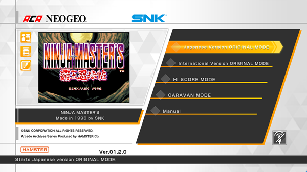 NINJA MASTER&39;S是 SNK于 1996年发行的一款格斗游戏。故事背景设定在日本国,十二位在战场上被称为恶魔的勇者,无论手持武器还是徒手格斗,都会在精彩的组合技和特殊攻击中展开激烈的对决。不要错过任何精彩动作,从提升伤害的力量槽,到带来精彩动作的超级燃爆模式!