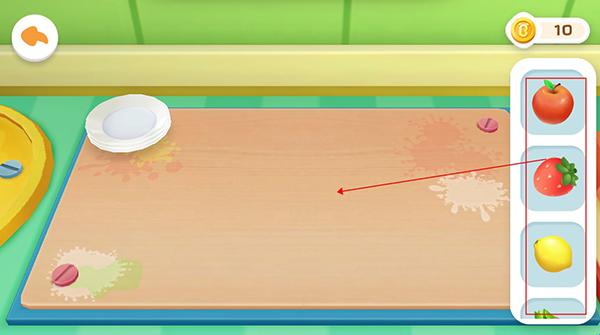 在制作雪糕的过程中,我们还可以加入一些新鲜的水果;用户可以在游戏的左侧选择三种宝宝最喜欢的水果,然后用手指滑动屏幕,将水果切成小块放入盘中;
