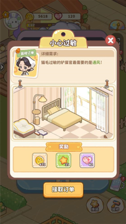 2、点击后玩家可以接取各种装修委托,接到委托后就会前往顾客的家中进行装修。