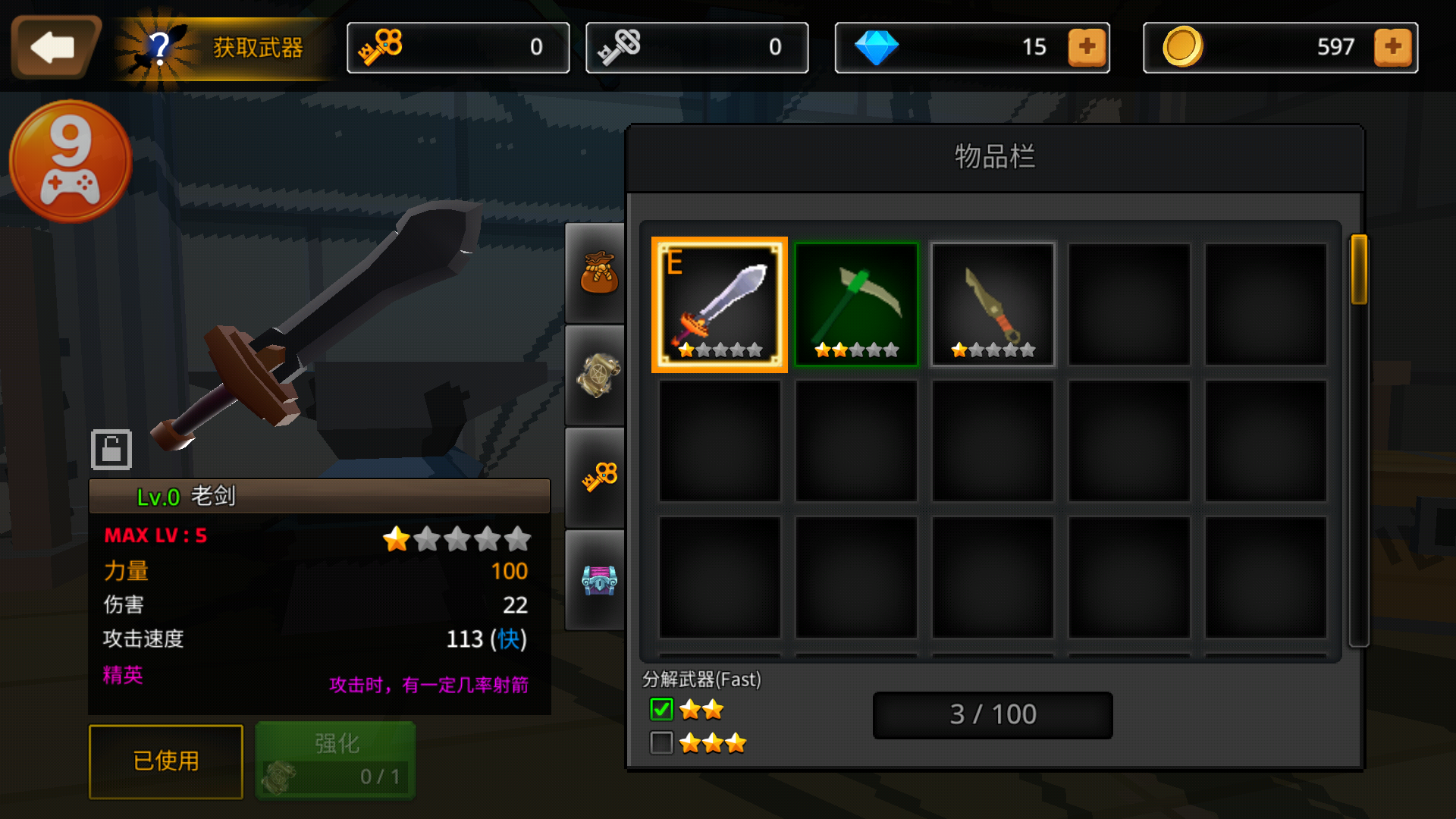 2、加入到这场刺激的地牢战斗中,每一种武器的性能你需要来进行熟悉。