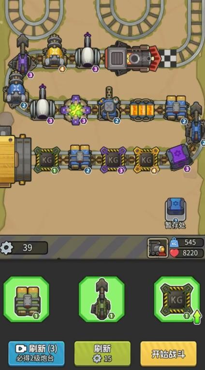 2、进入关卡后玩家需要将炮塔放在火车车厢上,相同的炮塔可以合并来提升等级。
