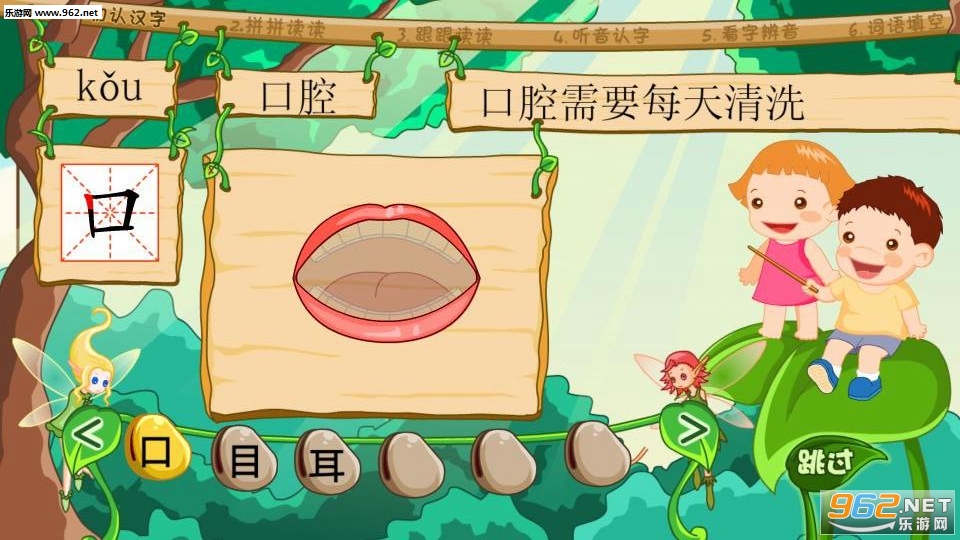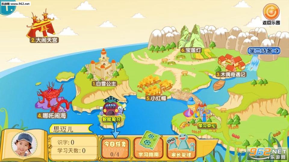 四大主场景,24个经典儿童故事为学习背景,360个与儿童故事情节相关的识字游戏。