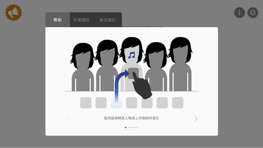 点击其中一个人物即可进入编辑模式,人物下方会有不同的音符,用鼠标把想要的音符拖拽到人物身上便会发出该类型的声音,每穿戴上一个,便会出现第二个人物,可用相同的操作,为其穿戴上声音图标。