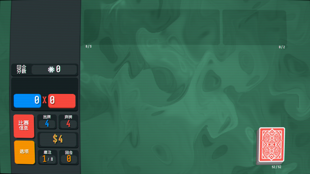 4.玩家初始携带一个52张扑克的牌组,手中始终有8张牌,出牌或弃牌后会自动补满,但次数均有限制。