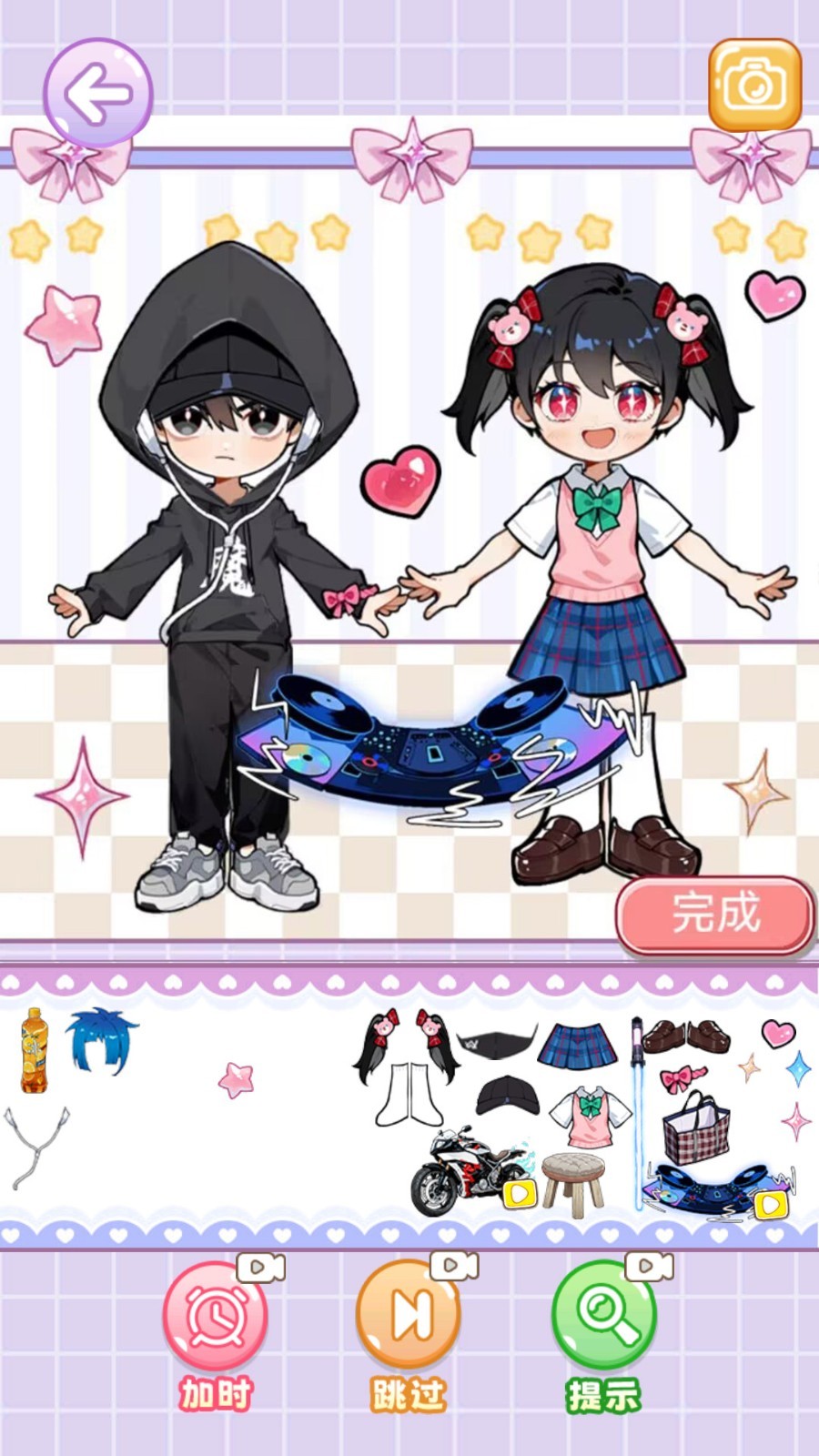 4、第二关是人物的装扮,你可以为每一个角色搭配眼睛和服饰,然后点击完成。