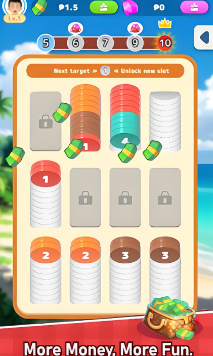 黄金合并是一款硬币排序合并游戏,内置关卡丰富,玩家们需要观察每块硬币随机刷新规律,将相同颜色进行排序即可获取丰厚的奖励,可以解锁更多硬币插槽!到后期其难度会逐步提升,非常考验玩家们的逻辑思维能力,掌握好技巧,必要时借助道具即可快速通关喔!
