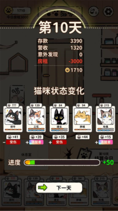 4、点击结算今日后可以完成顾客的订单获得猫猫币,每隔一段时间需要上缴一定的房租来完成任务,并且每完成一个订单猫猫们都会减少一点精力。