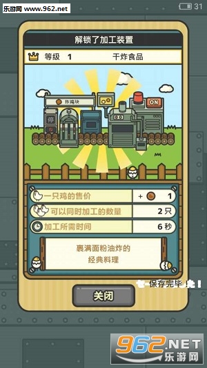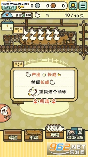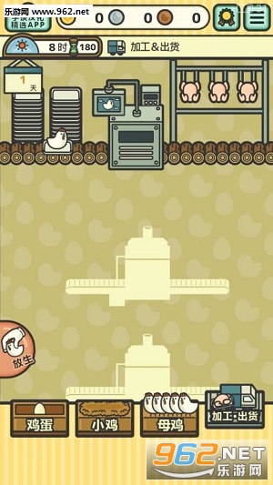 今日起,你被指定为养鸡厂厂长!从流水线上饲养母鸡,下多多的鸡蛋,孵化小鸡,再将鸡养大,做成……鸡肉料理!鸡鸡那么可爱!怎么可以吃鸡?……真香真好吃加点辣,啊不对不对。你必须维持工厂的运作,培育越来越多的鸡。千万不要被美食所诱惑哦……