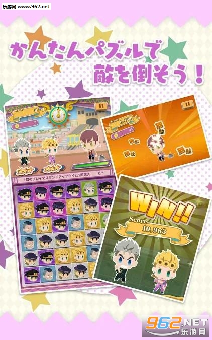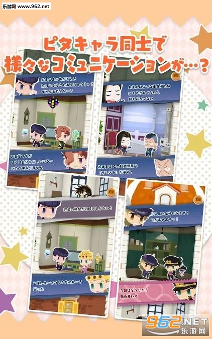 《JoJo的奇妙冒险》是游戏商Bandai Namco开发的一款Q版画风的消除战斗游戏,本作为一款以荒木飞吕彦人气动漫大作《JoJo的奇妙冒险》为题材的益智类型游戏,游戏中将会收录《JoJo的奇妙冒险》系列众多登场人物角色,以可爱的Q 版造型在游戏内登场,让玩家们能够收集培育这些可爱的角色,以及各式各样的家具物件,来打造装饰自己专属的公寓,并与各式各样的系列角色们一起在里面进行互动交谈,或是跟自己喜欢的角色一起拍照,享受游戏所带来的丰富互动体验!