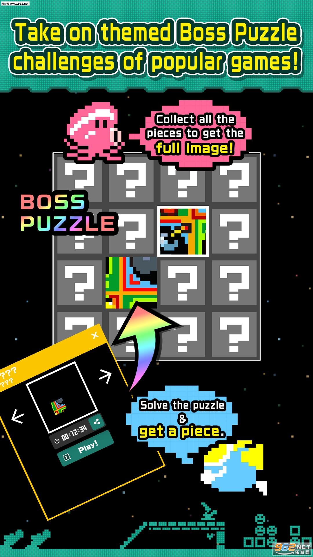 接受Boss Puzzle挑战并收集小拼图以完成一个巨型像素艺术作品!