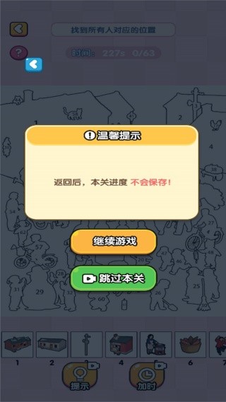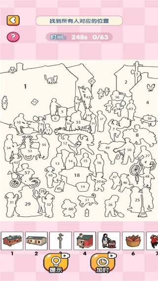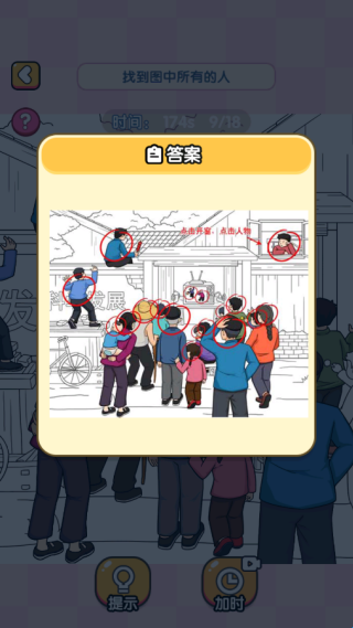 4、观察图中的人,点击所有的人,对于隐藏起来难以发现的,可以点击提示帮助你寻找。