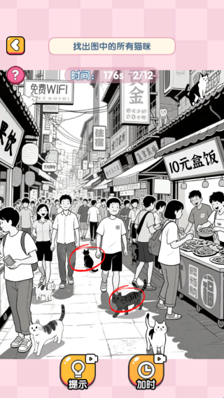 2、图中有12个猫咪,你需要将隐藏在夜市的猫咪全部找出来,就可以完成本关任务。