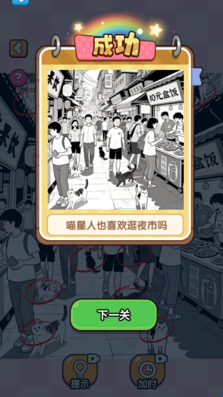 3、成功找到所有猫咪,闯关成功,就可以解锁下一关进行畅玩。