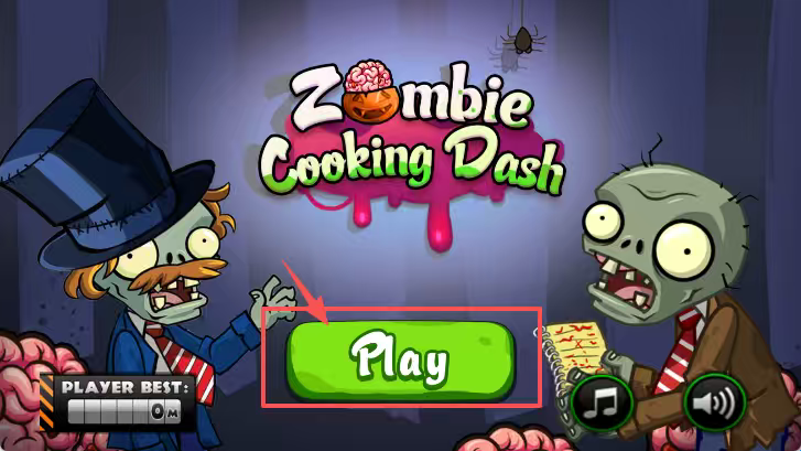 1、看到游戏启动界面,两个僵尸在中间,上方有彩色标题,直接点绿色Play按钮就能开始玩,左下角能看到自己最好成绩。