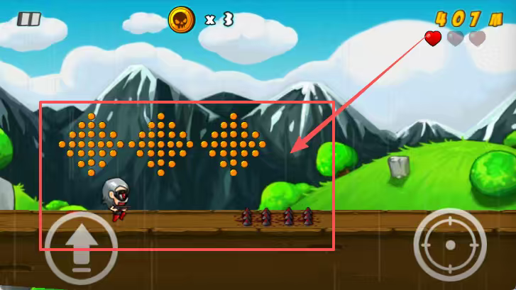 3、在横版闯关游戏场景里,看屏幕上方骷髅头数字和右侧金币数,点左下角红色方框里白色向上箭头就能让角色跳跃。