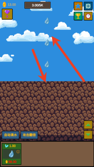 2、持续点击或短暂放置让水滴自动掉落,不断积累金币,然后进入升级界面,使用金币提升水滴的冲击力、掉落频率等属性,以提高每次点击的收益。