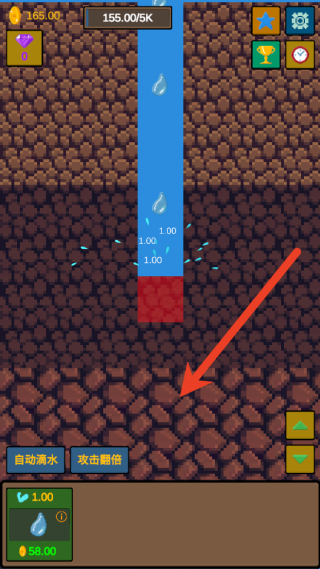 1、通过持续点击屏幕让水滴落下,每次点击都能侵蚀石头并获得金币。