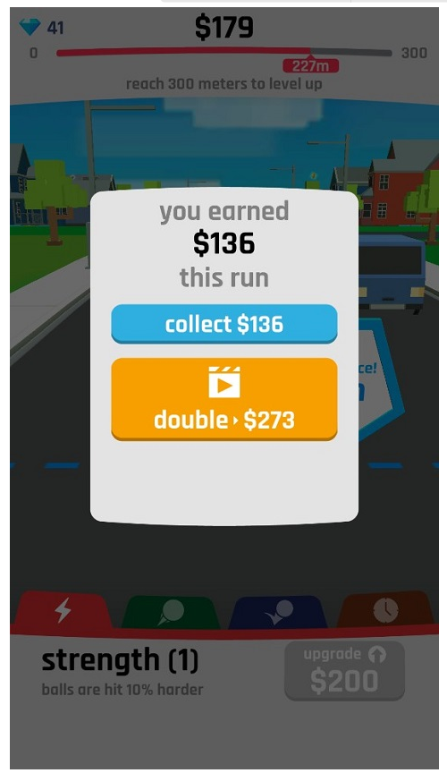 3、期间你可以升级力量,提升技巧来获得更远的击球距离,在人物的底部有红、绿、蓝和橙色的不同升级方式。