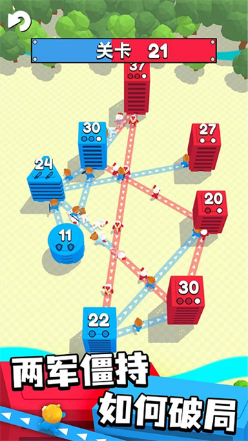 城市争夺战中文版是一款休闲类的轻度策略小游戏,英文名为City Takeover,由海外知名厂商Voodoo发行,风格上继续保持其一贯作风,海量关卡的巧妙设计,每一关都有新的挑战难度可以尝试。在这里,玩家做为指挥官主要通过画线连接的方式,执行进攻路线,当大楼内的人数达到最大值,可手动取消连接。