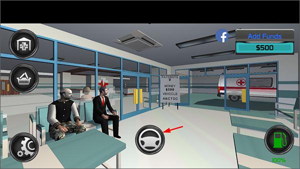 1、玩家打开急救车模拟器游戏,进入游戏主页面,在该页面中玩家可以查看当前驾驶的急救车设置和油量等信息,点击车辆方向盘按钮;