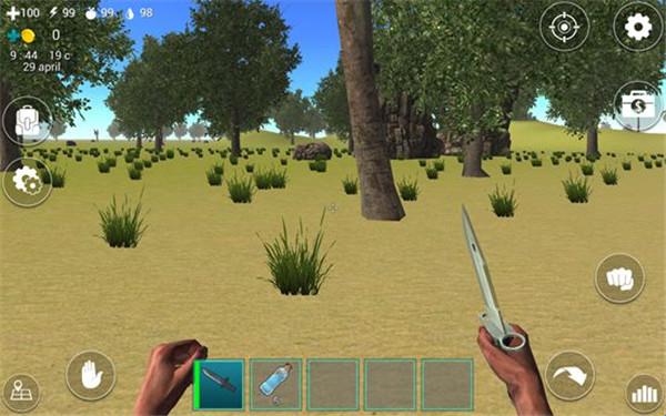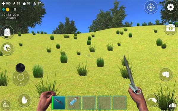 3、在屏幕下方的道具栏中有一把匕首和5瓶水,我们点击匕首即可拿在手中。在屏幕左上角有四个图标数字,分别表示血量、体力值、饥饿值、口渴值。