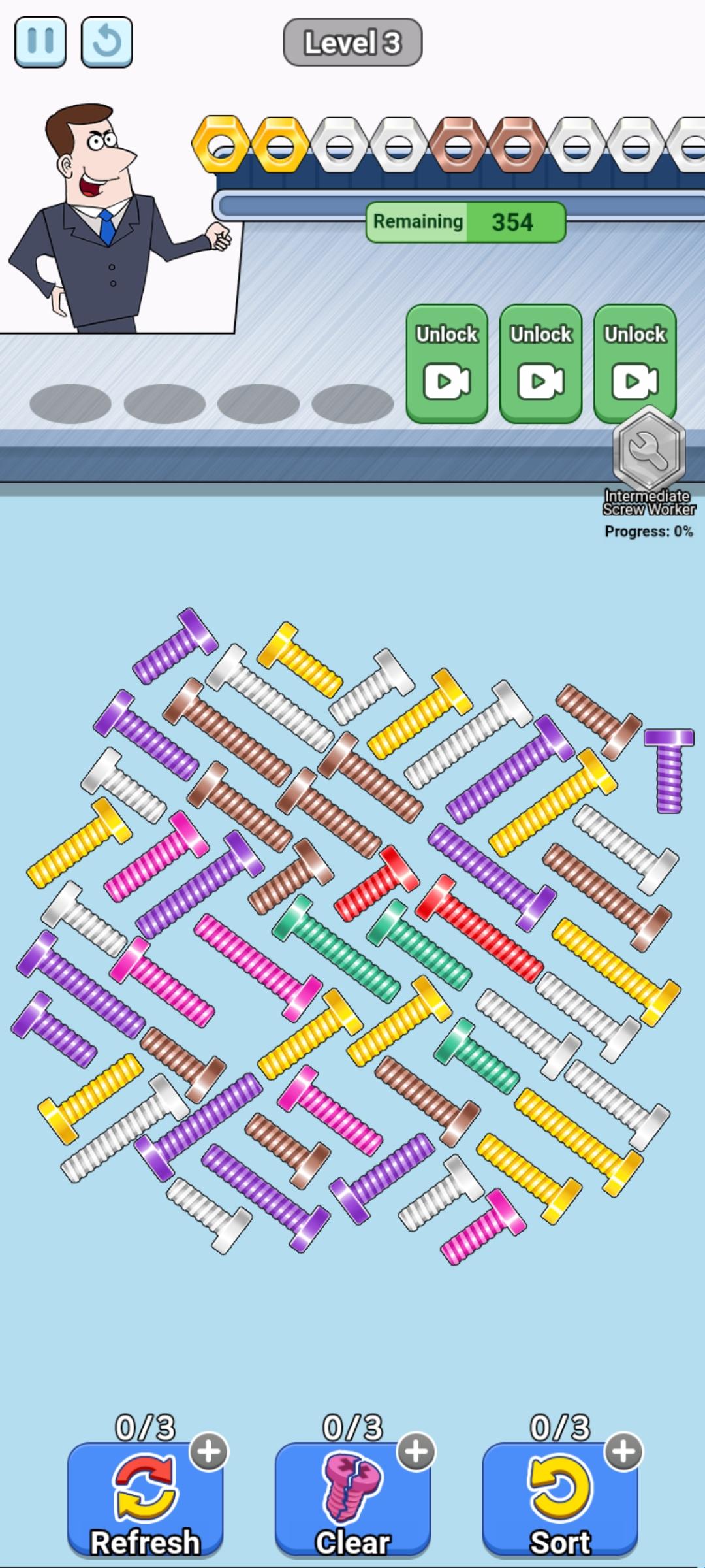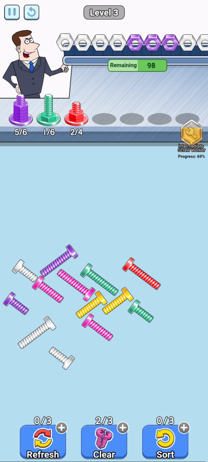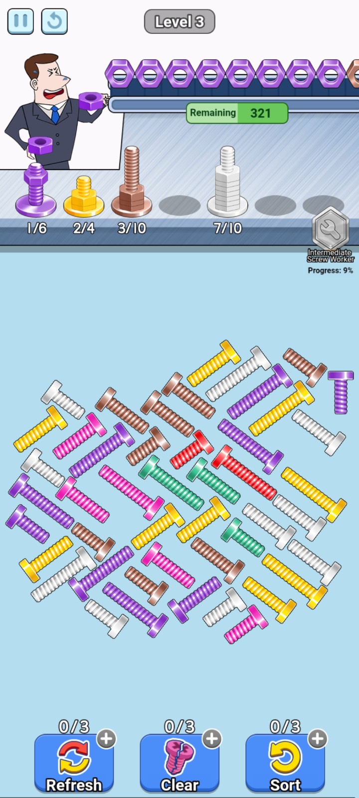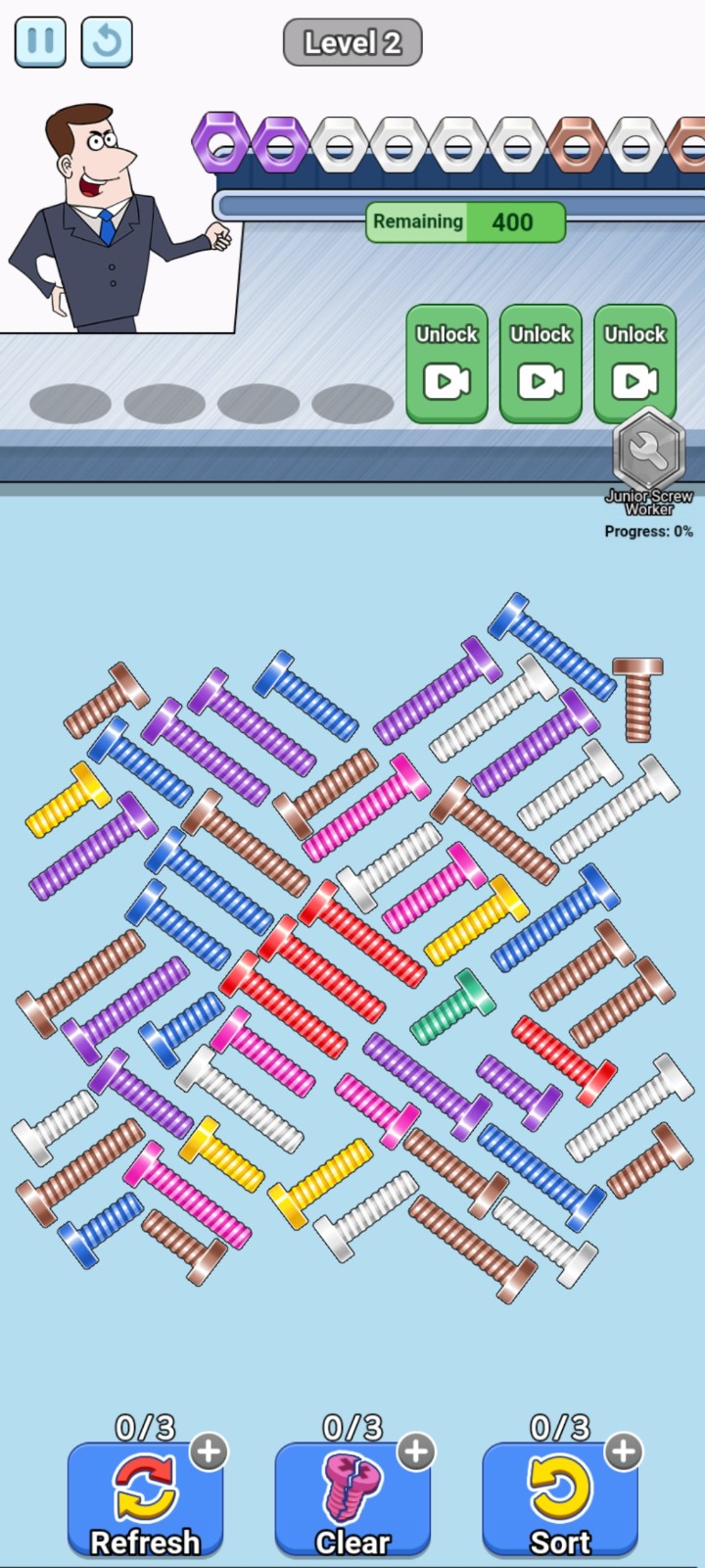 在《最好的螺丝》中,考验你的解谜技巧,在混乱的螺栓堆中穿梭!你的目标是将相同颜色的螺栓与其对应的螺母匹配,将它们从队列中移除。从杂乱的组合中策略性地选择并操作正确的螺栓。每成功匹配一次,挑战就会升级——你能保持敏锐并清除队列吗?准备好迎接经典匹配游戏玩法中多彩而引人入胜的创新吧!