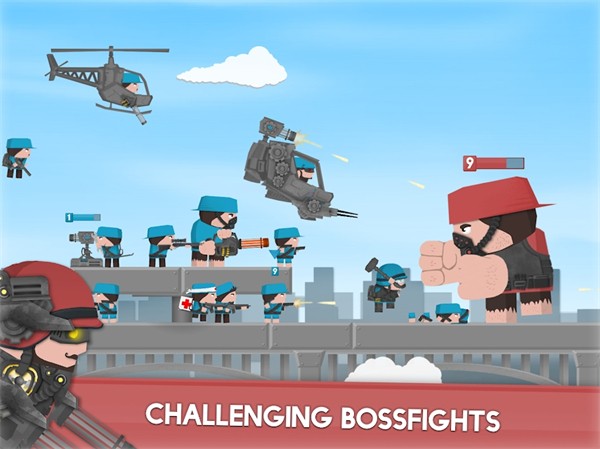 价格750,对于前期来说价格偏贵,但是一定值得买。因为这个兵种无敌注意!无敌。你没看错,特别是玩endless mode模式时,时限完全不是问题,基本是你想玩多久就玩多久。那么,为什么他无敌呢?很简单,可以飞到天上屏幕最顶端,而敌方的空中兵种却也打不到你,也没有地对空导弹什么的。当你飞至屏幕上方,把敌人放在屏幕右侧,这会是手雷兵手雷抛物线的着地点,对付射程较远的步枪兵和RPG兵是,只需在屏幕中央适当地左右移动就可避免子弹/导弹。