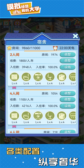 我的大学是一款全新经营模拟游戏,玩家模拟当校长经营你的大学,各种建筑大楼设施等你完工,招聘高级教师,招揽更多生源,扩大学校建设,提高学生成绩,建造一所顶级大学。