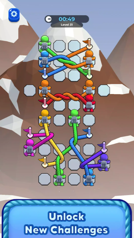 在这款惊险刺激的登山益智游戏中,挑战你的解绳技巧!解开绳索,帮助登山者登顶。你准备好攀登并征服山峰了吗?