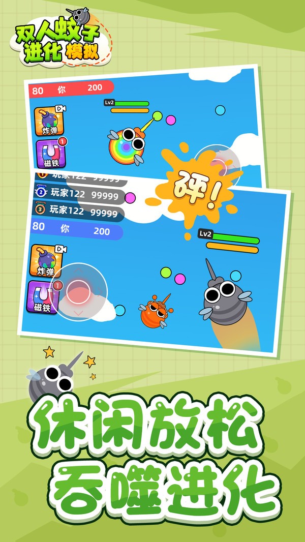 玩家扮演一只蚊子,与其它蚊子在场景中竞争食物,如果用嘴扎到其它蚊子,可以吸干其它蚊子,获得它的能量。游戏支持双人分屏共同游戏,给玩家带来欢乐体验。