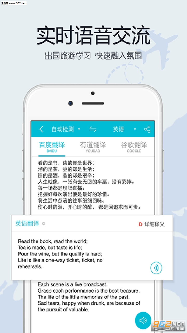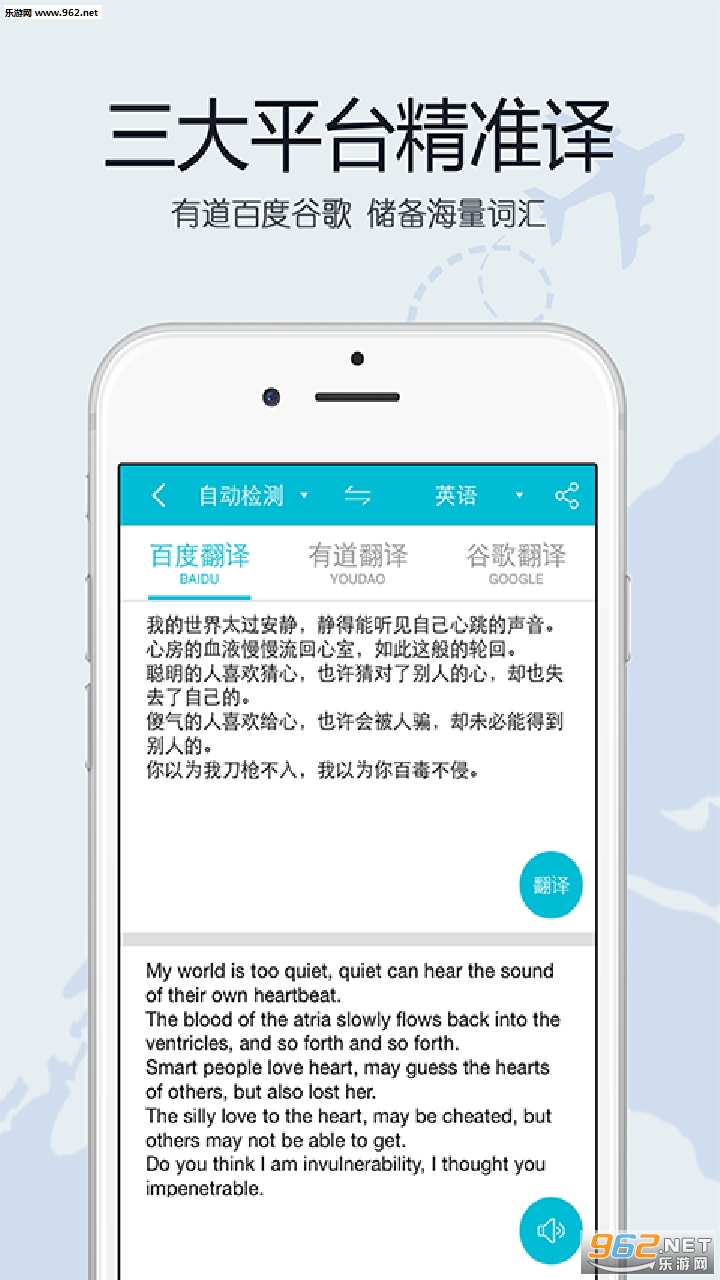 翻译工具箱集成了百度翻译,谷歌翻译及微软翻译三大翻译平台,能够提供给你多种翻译结果对比参考,并且集成了先进的语音识别技术和图片识别技术,能有效提高您的翻译效率,是您工作、生活、学习、旅游等的必备翻译神器。