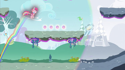 6、拾取彩虹能量后,可进入飞行状态,皆是玩家需要通过向上或向下滑动屏幕,拾取小马能量获得更多的得分。