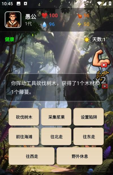 重复去丛林砍树回家,然后睡觉这几个步骤。要在血量大于30之前到家。不然就会噶。