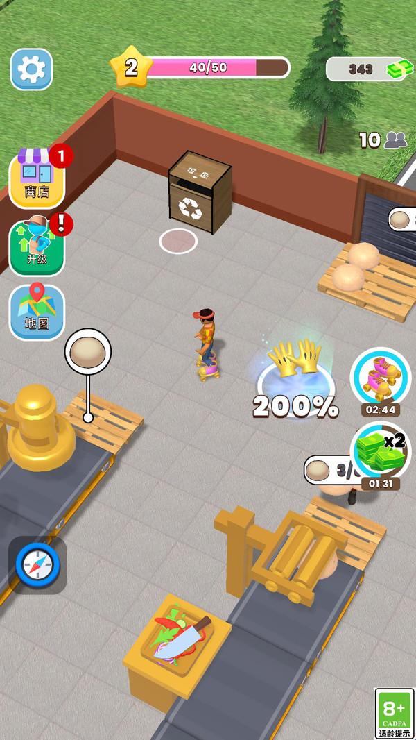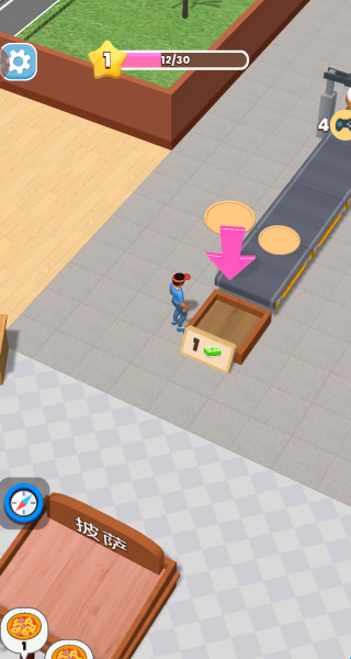 2、制作多样美食:根据顾客订单需求,在制作台搭配食材制作美食,如用面团+酱料+芝士制作披萨,完成后通过传送带送到顾客面前,获取收益。