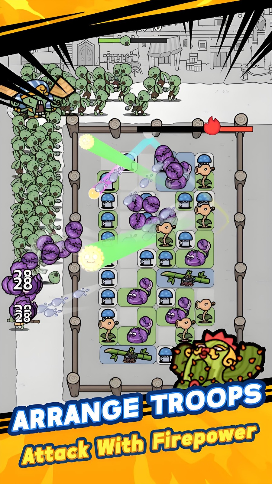 1、玩家需将植物部署于围栏内,围栏中滚动的弹球触碰植物时,会触发其专属攻击技能,精准打击来袭僵尸。
