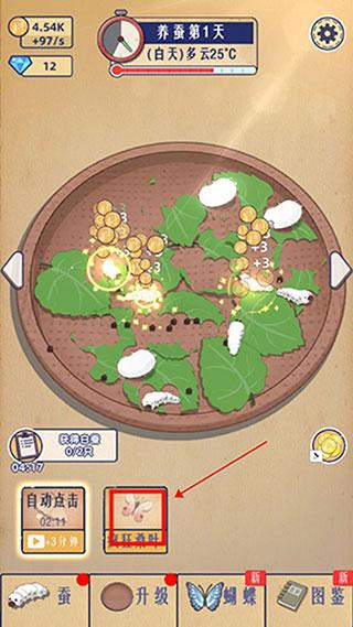 6、点击下方刚刚获得的蝴蝶可自动点击蚕宝宝加快金币的收益哦;