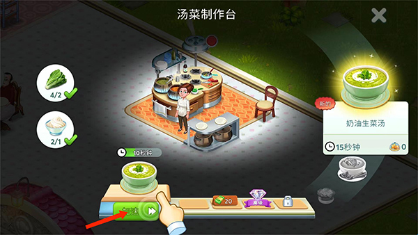 3、来到汤菜制作台,可看到顾客点的餐品,依次将餐品拖动到制作台上,然后点击【加速】选项;